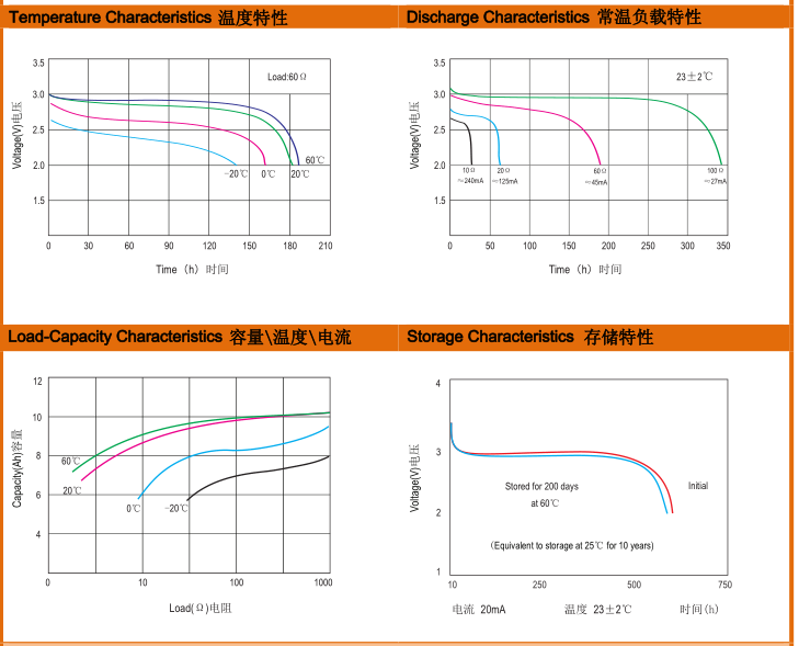 产品型号:CR34615 IEC型号: D 额定电压(V):3.0 重量(g):125 标称容量电流(mAhmA): 12000 最大持续放电电流(mA):2000 工作温度(℃):-40~+70 终止电压(V):2.0 CR34615产品规格书下载