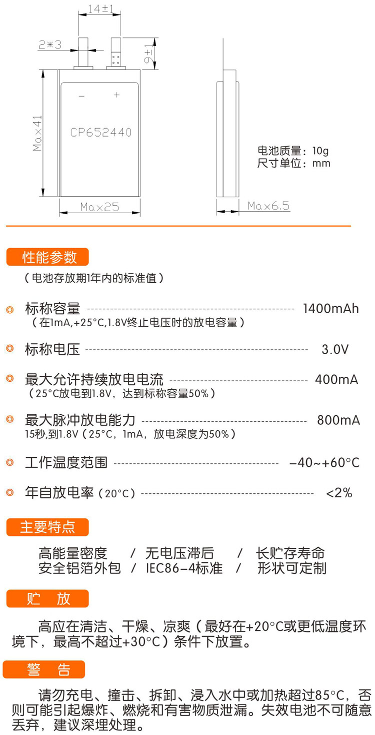 产品型号:CP652440 额定电压(V):3.0 重量(g):10 标称容量电流(mAhmA): 1400 最大持续放电电流(mA):400 工作温度(℃):-40~+60 终止电压(V):1.8